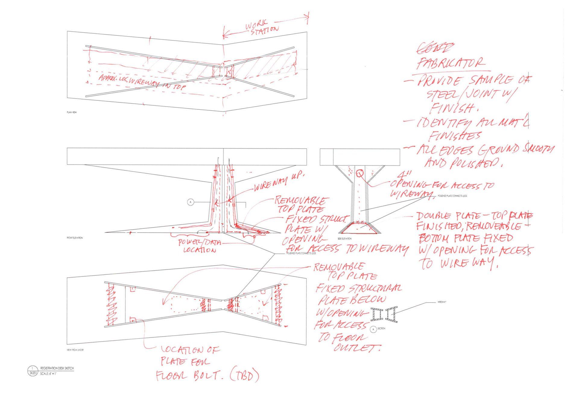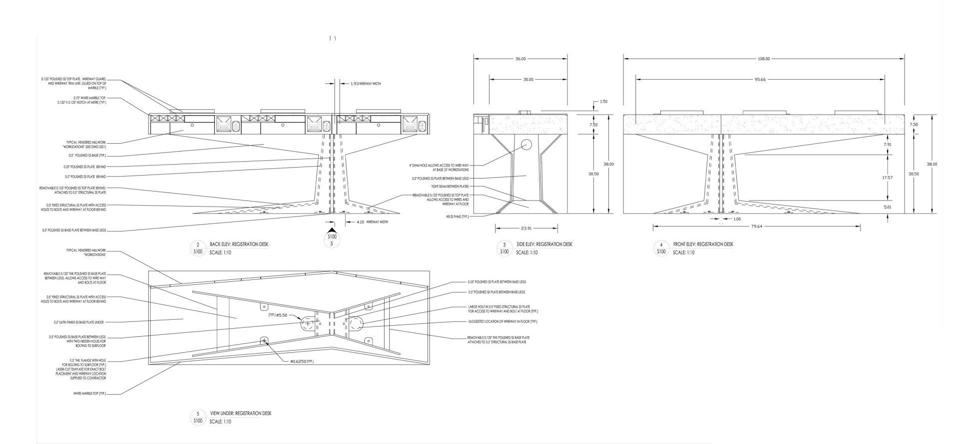to develop a series of integrated reception desks for the main lobby area of the hotel. Each desk is fabricated from cantilevering mirror polished stainless steel plates that support the stone tops. The electronics and computers are completely integrated into the steel, stone and the hardwood cabinetry.