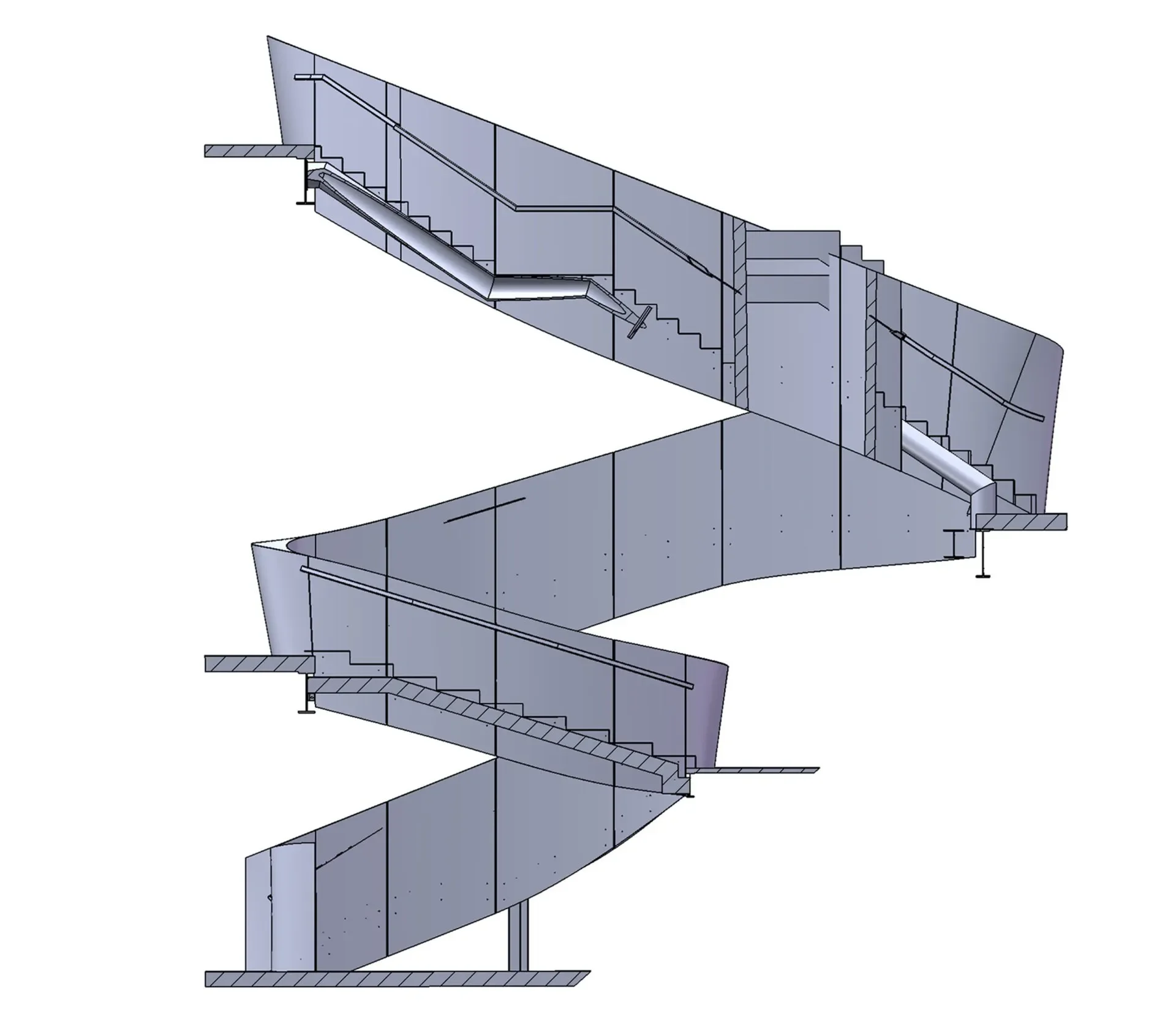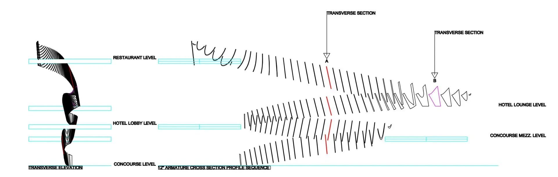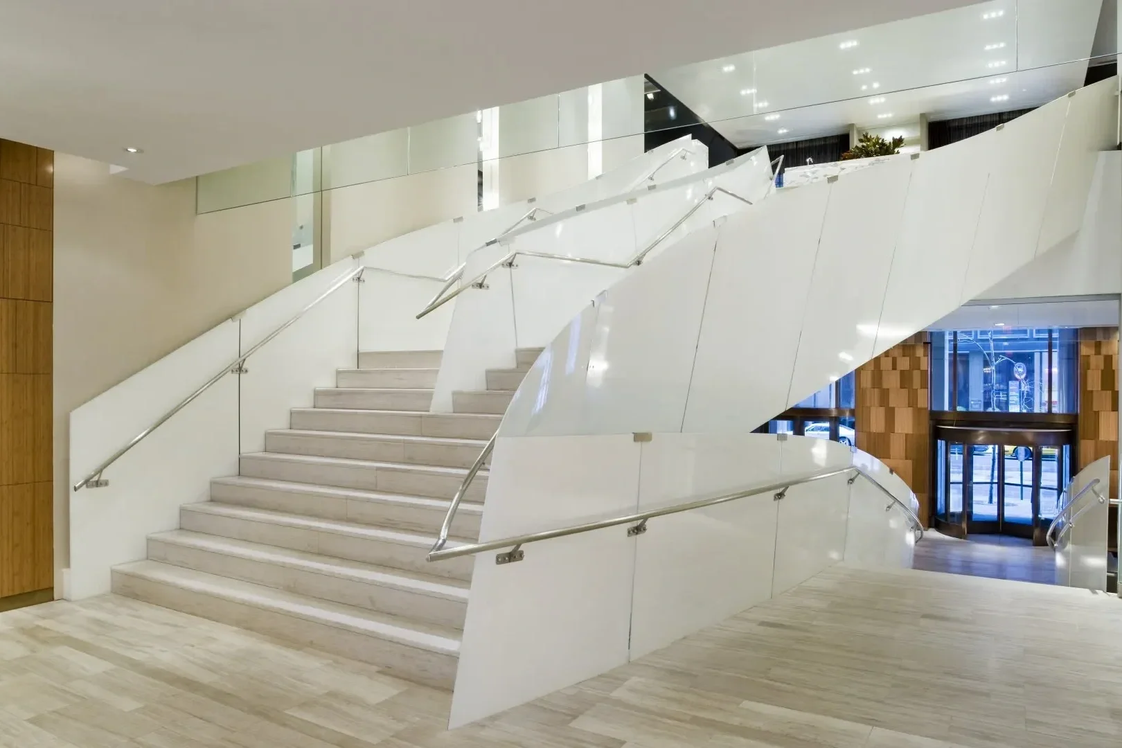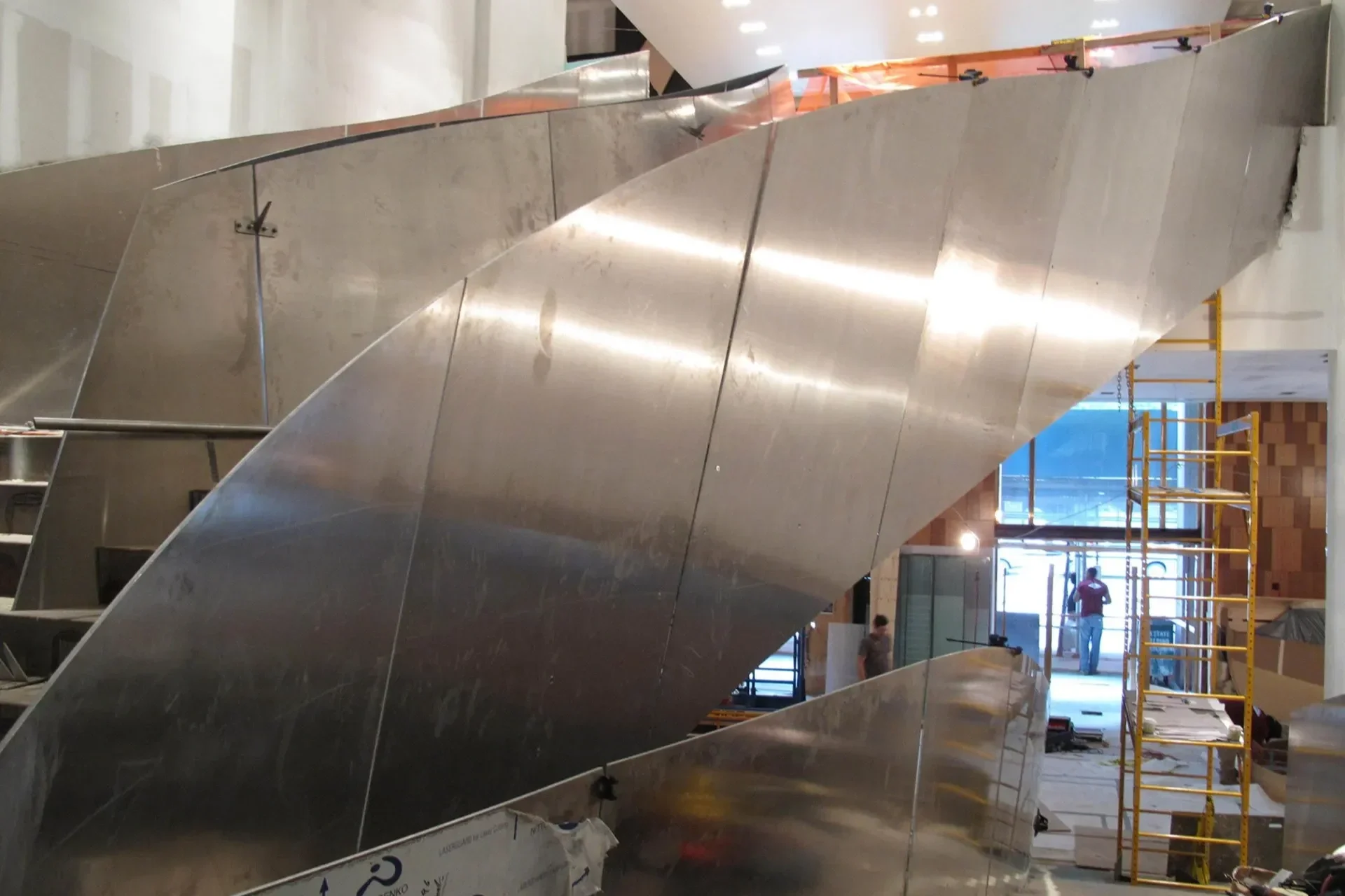 The structure was supported by a concealed framework of 12-inch mitered and welded steel tubes. Curved ¼-inch aluminum side panels flowed upward with a continuously shifting pitch, creating a sculptural ascent that defines the lobby’s central space.