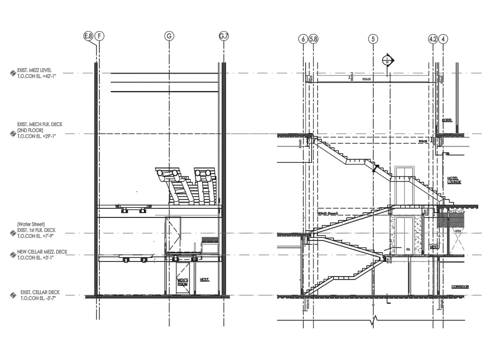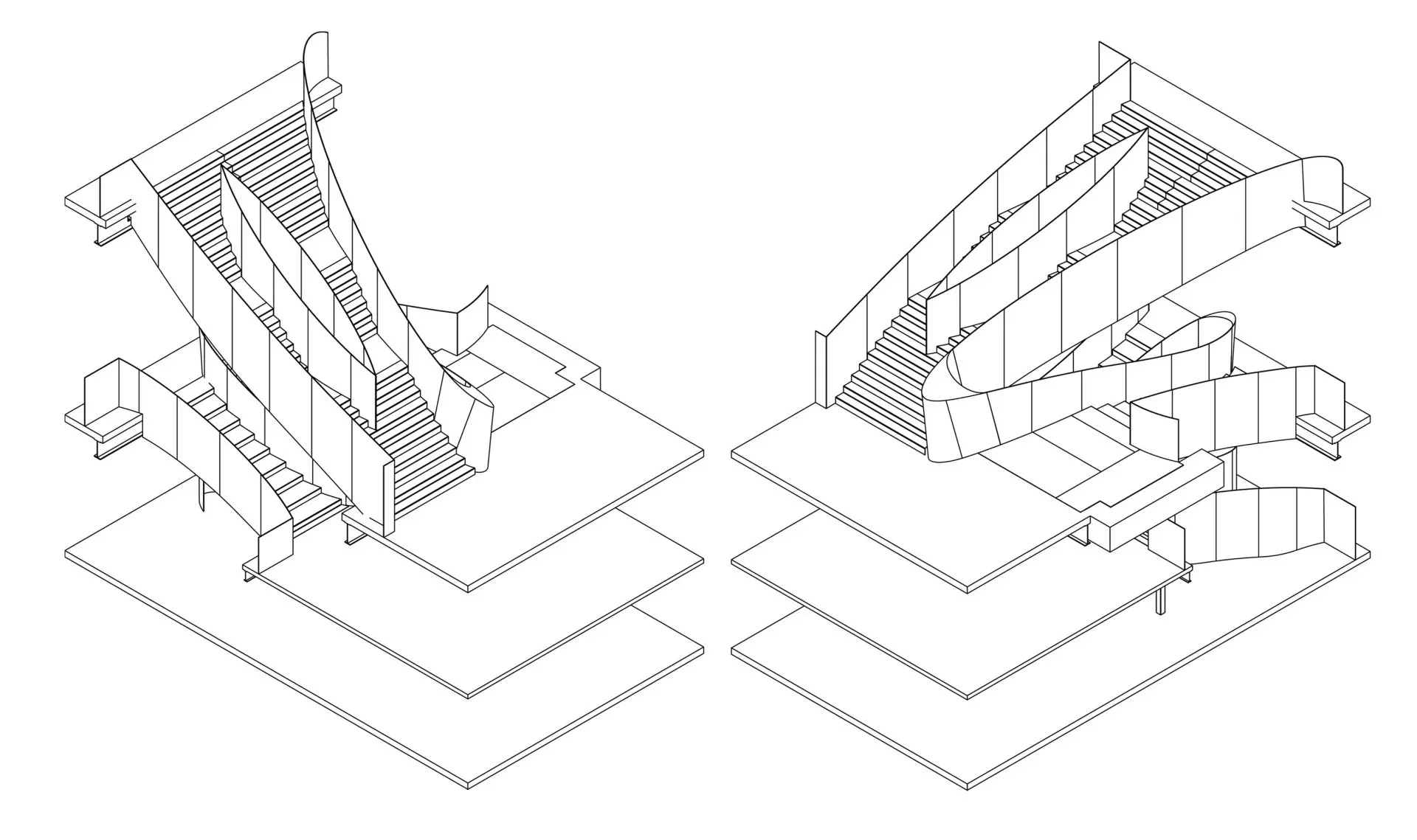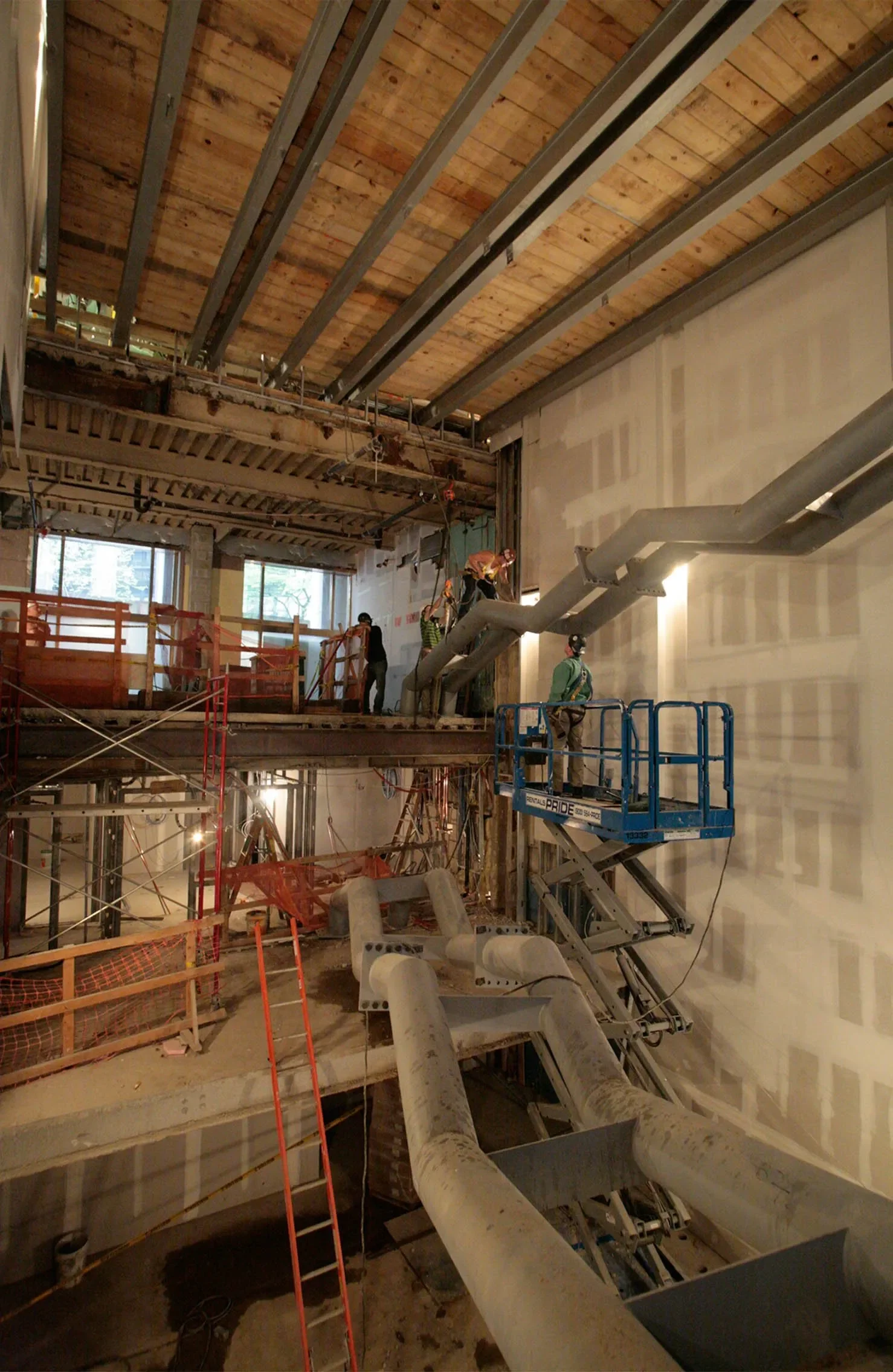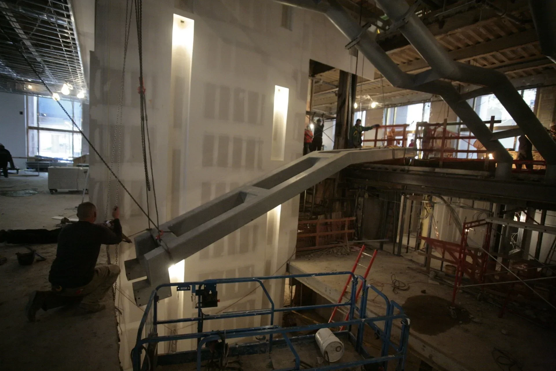 Workspace11 partnered with the Rockwell Group to design and build a four-story spiral staircase spanning a 60-foot vertical opening in the main lobby of the Andaz Wall Street Hotel.