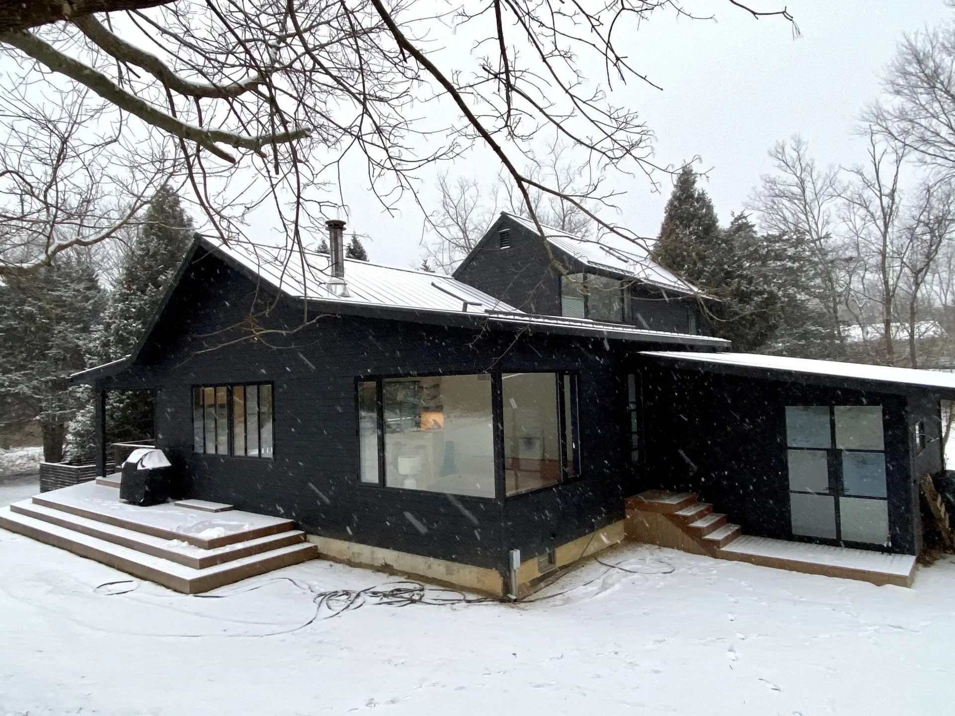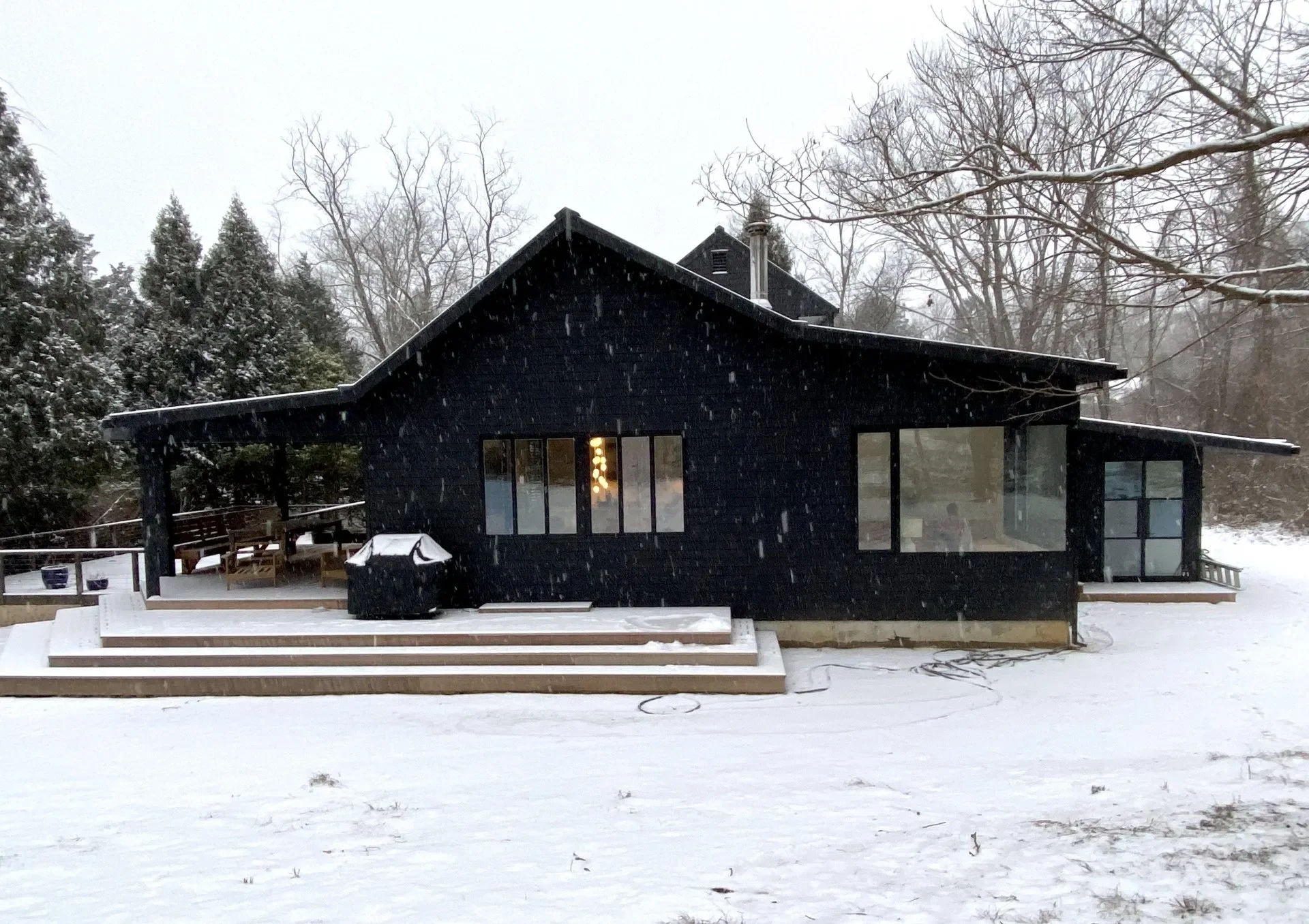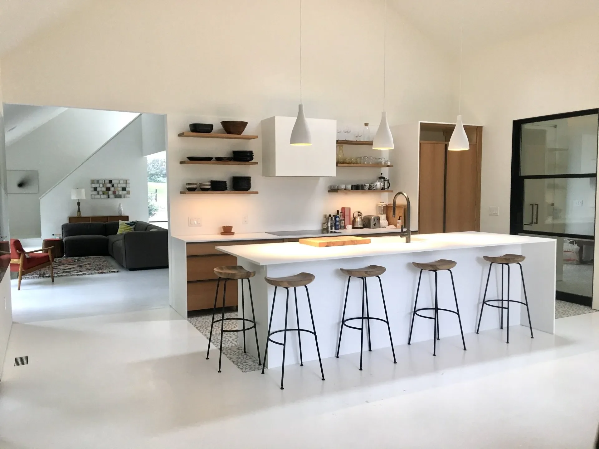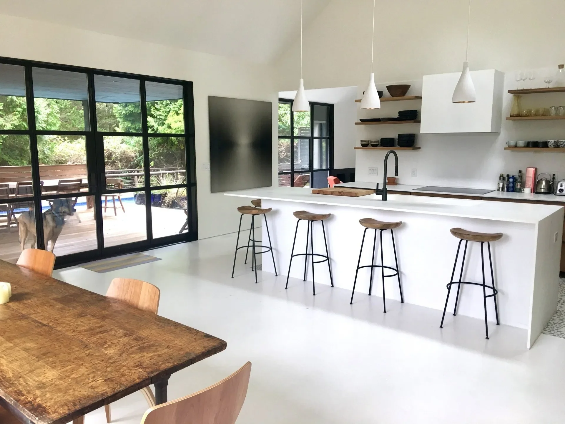 Drawing inspiration from traditional barn architecture, Workspace11 expanded the structure by 1,200 square feet with 18-foot ceilings and designed custom steel and glass doors, eight-foot bifold openings to the pool terrace, and large corner picture windows. The design emphasizes a seamless connection between indoor and outdoor living, capturing natural light and framing views for all seasons.