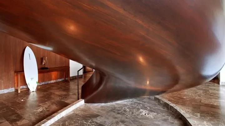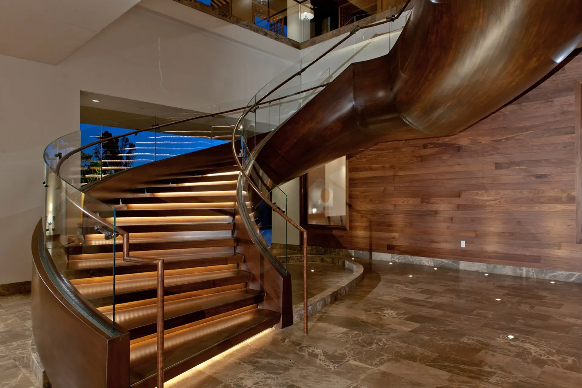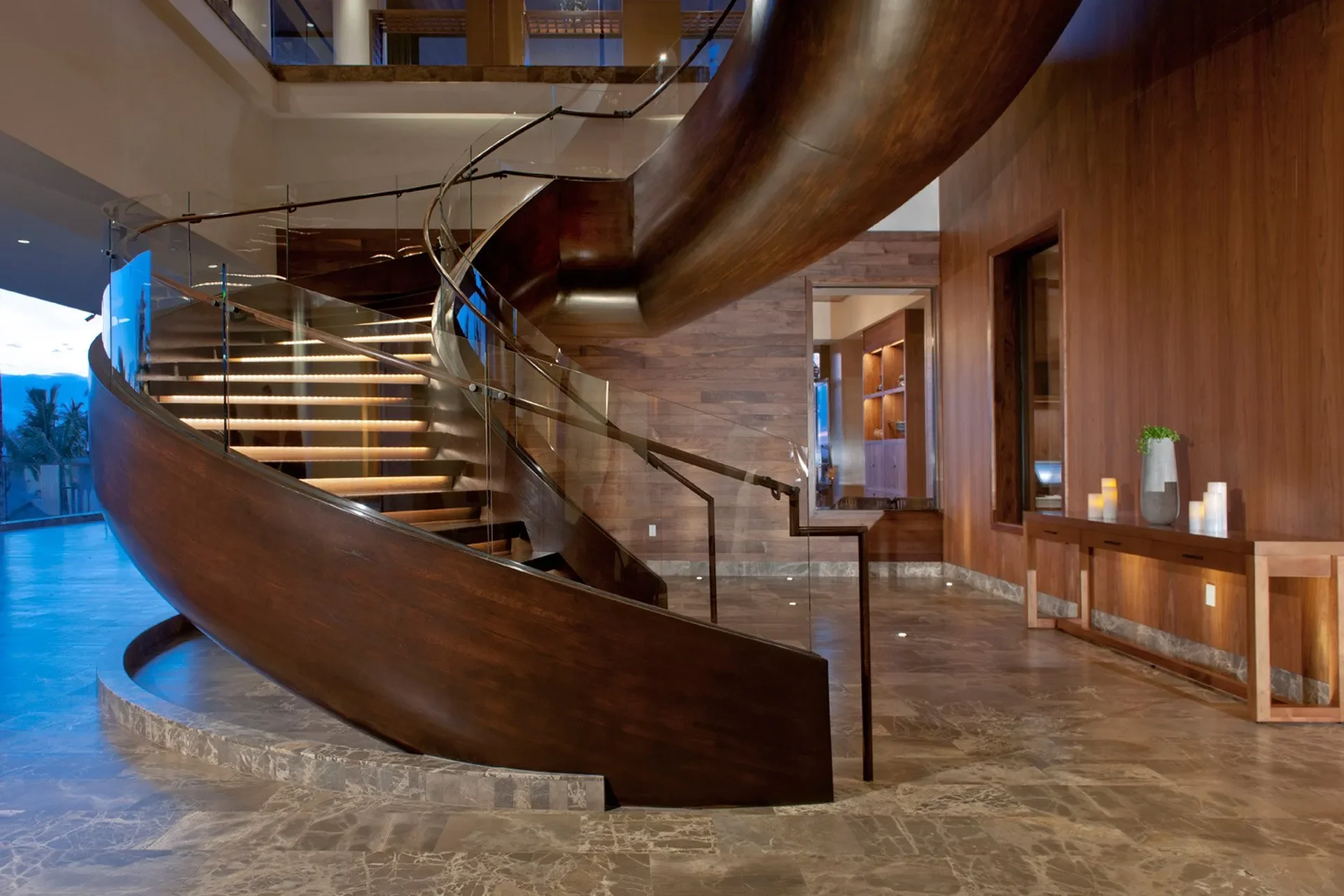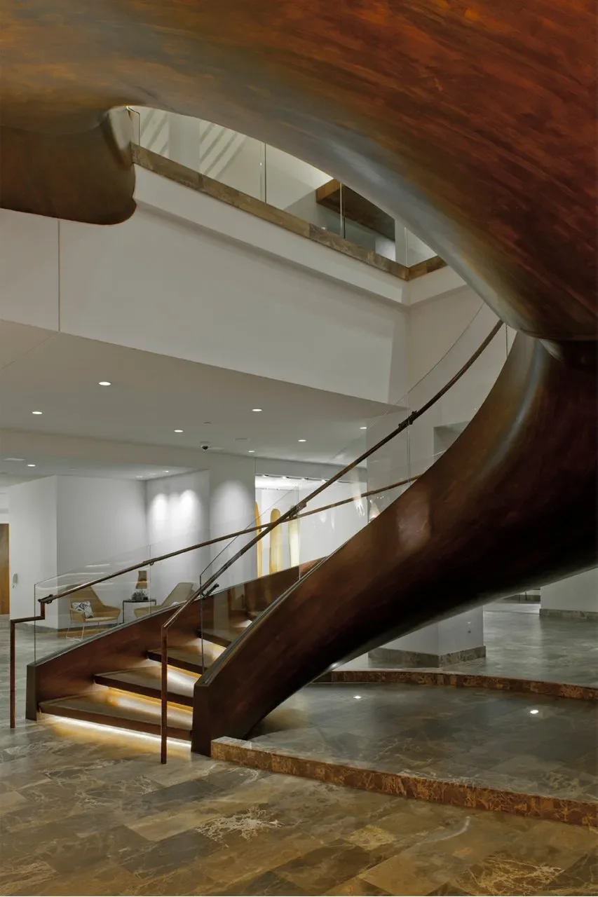 Inspired by the internal structure of a nautilus shell, the free-floating stair was fabricated from cold-molded white oak using traditional boatbuilding techniques. The internal frame of curved CNC-formed steel tubing supports a curved glass guardrail with custom-machined bronze brackets, combining organic form with structural precision.