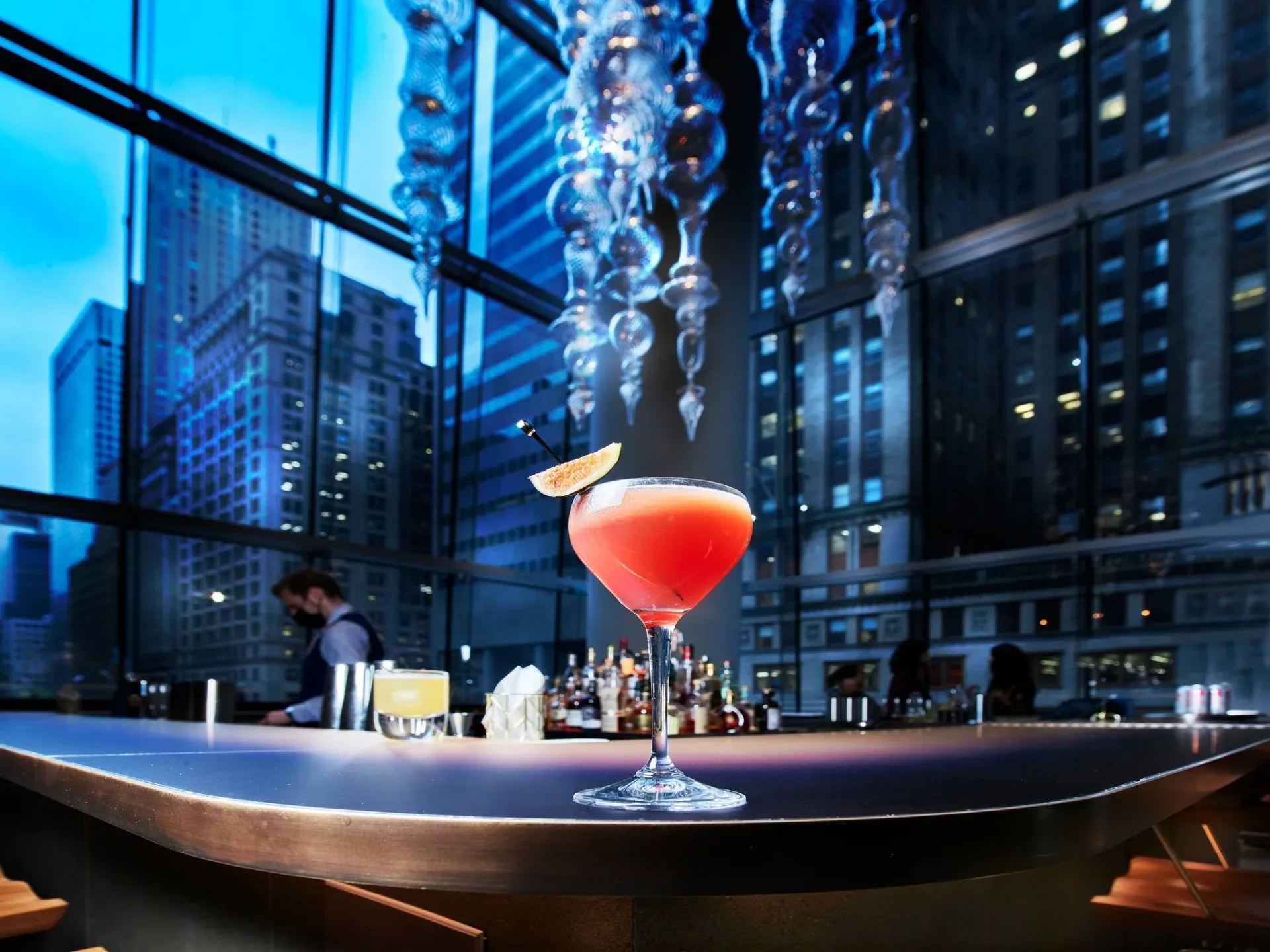 The team fabricated the full feature bar and the sculptural entry stair, integrating metal, glass, and stone to create an elegant transition between the restaurant’s urban setting and its natural, immersive interior.