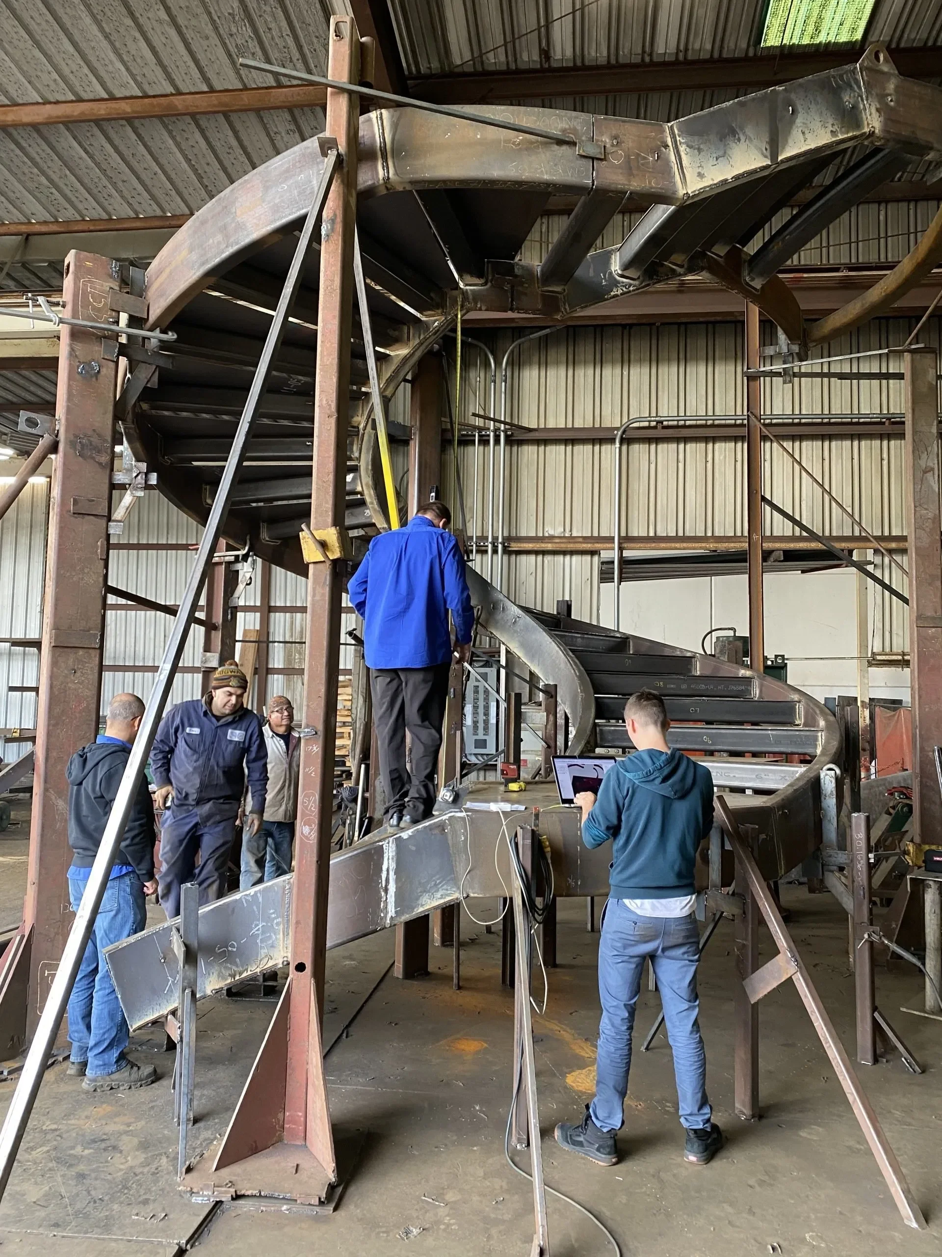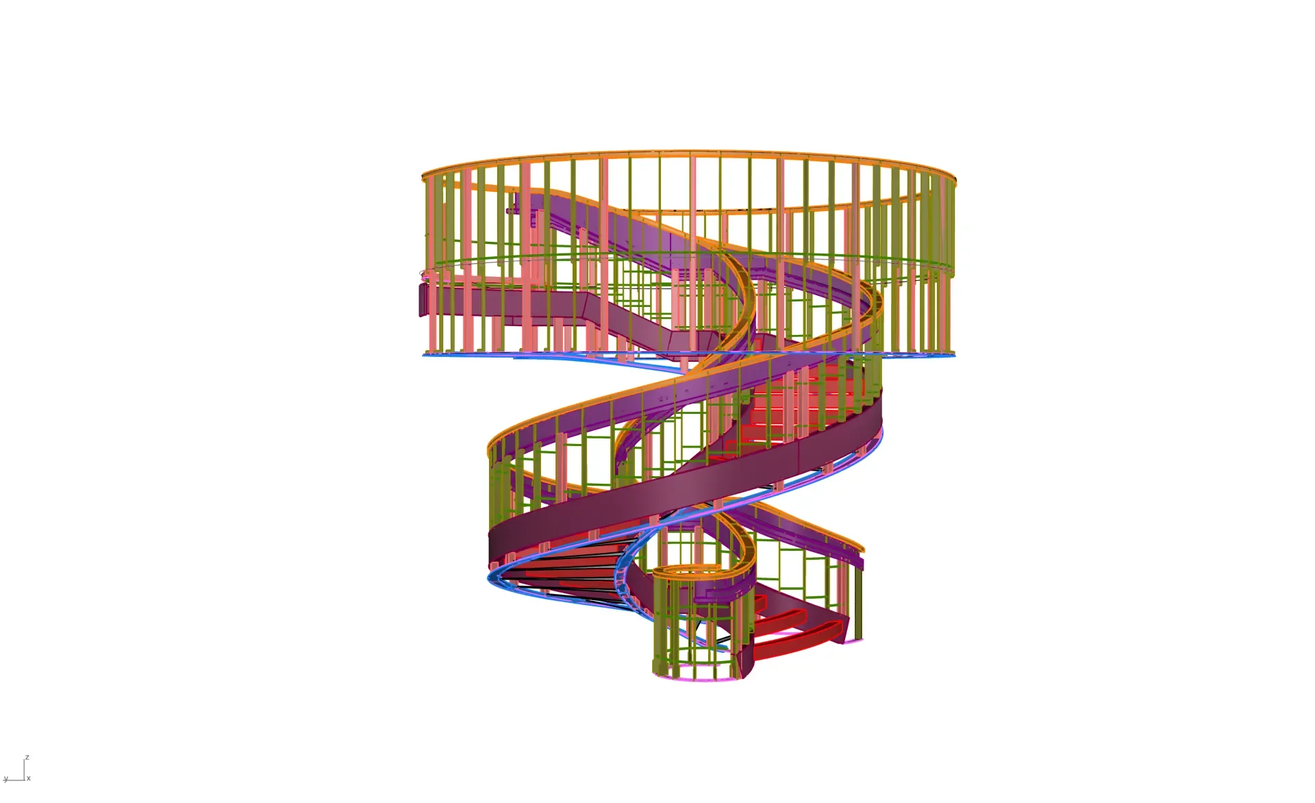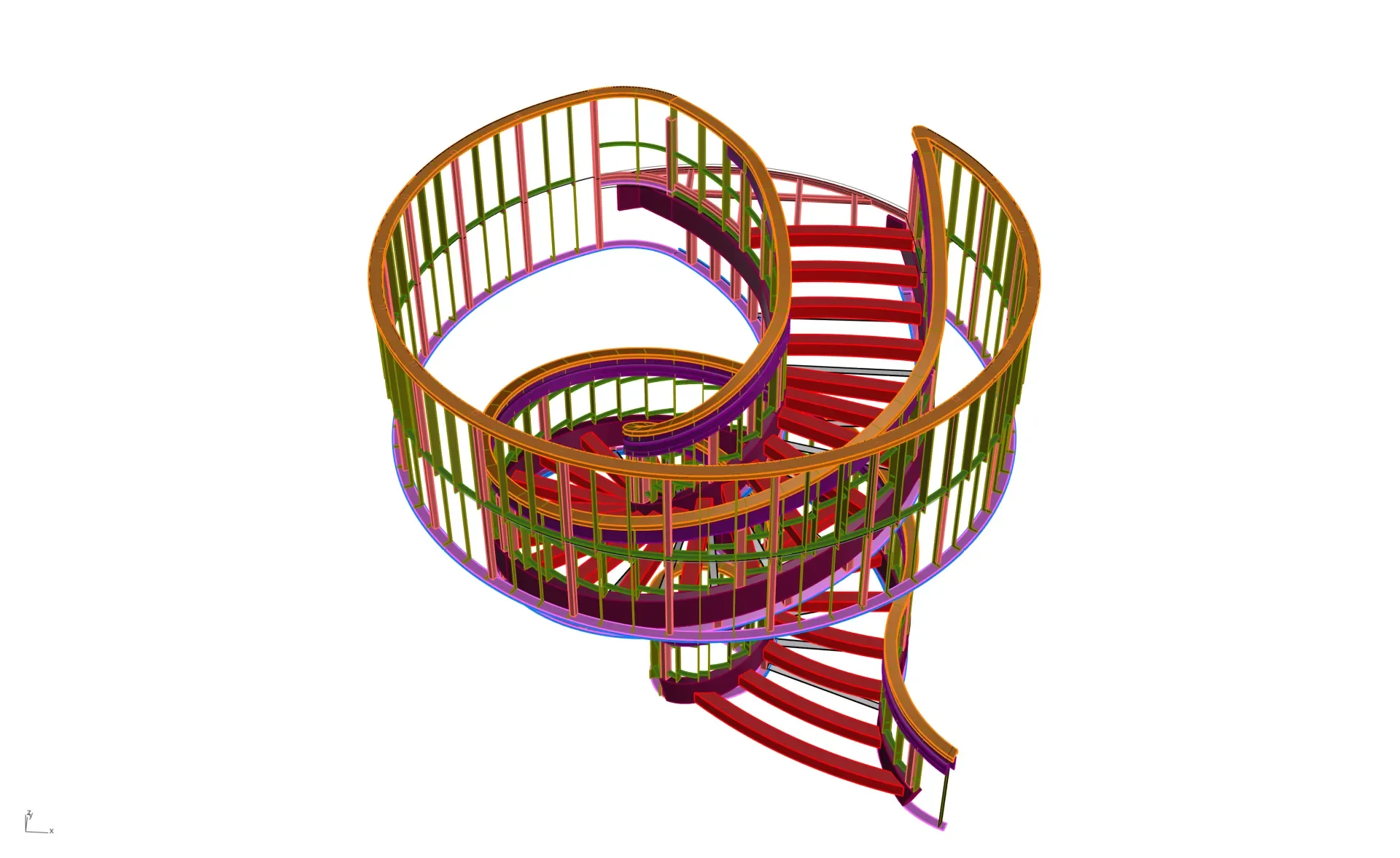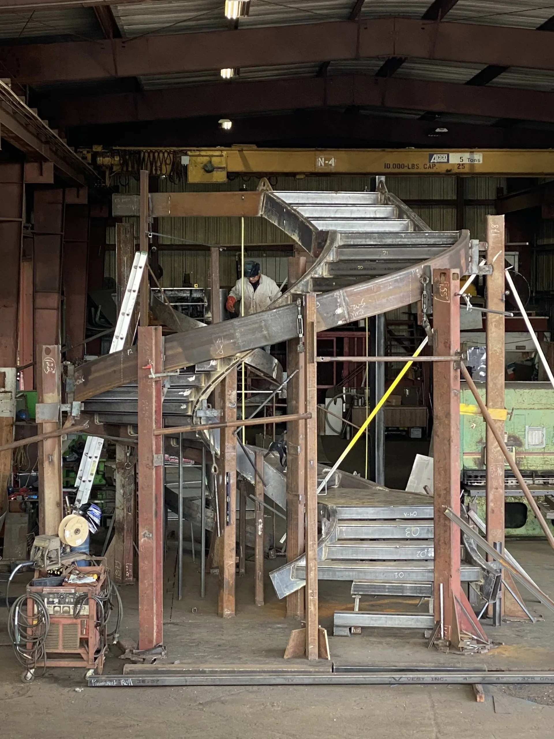 Developed in close collaboration with Forrest Perkins Interior Design, the stair was inspired by the organic geometry of a nautilus shell. The free-floating structure was fabricated from induction-bent steel tubing with an internal rib system supporting decorative finishes in patinated bronze and marmorino plaster. The staircase integrates seamlessly into the building’s oculus, creating a dramatic architectural focal point.
