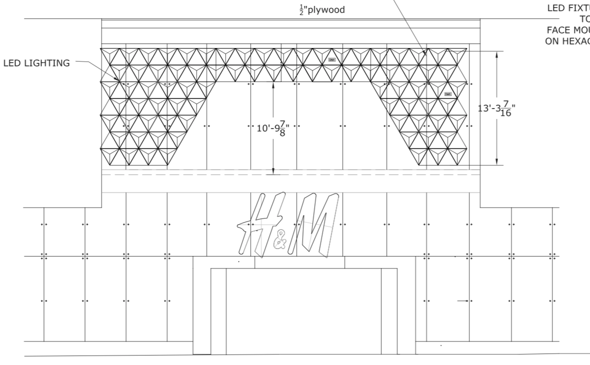 Workspace11 continued working with TEK architects and the H&M design team to develop a modular facade system of break-formed aluminum panels for the H&M in Easton town center, Ohio. The system was based upon three interchangeable panels that created an ever-variable pattern that can be applied to many different site conditions. The panels hang on a frame system that is first applied to the facade, which allows the panels to be very quickly and seamlessly installed.