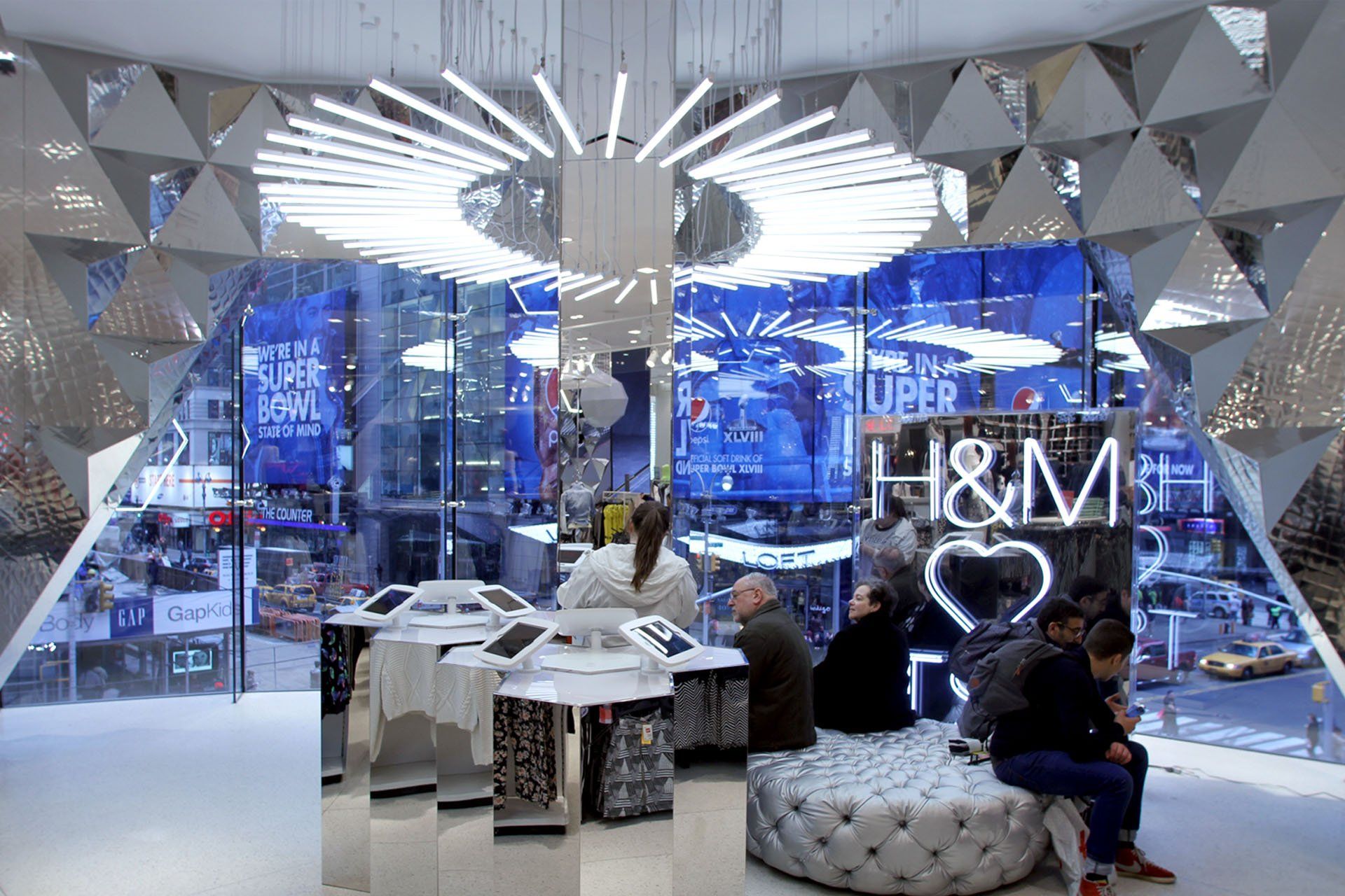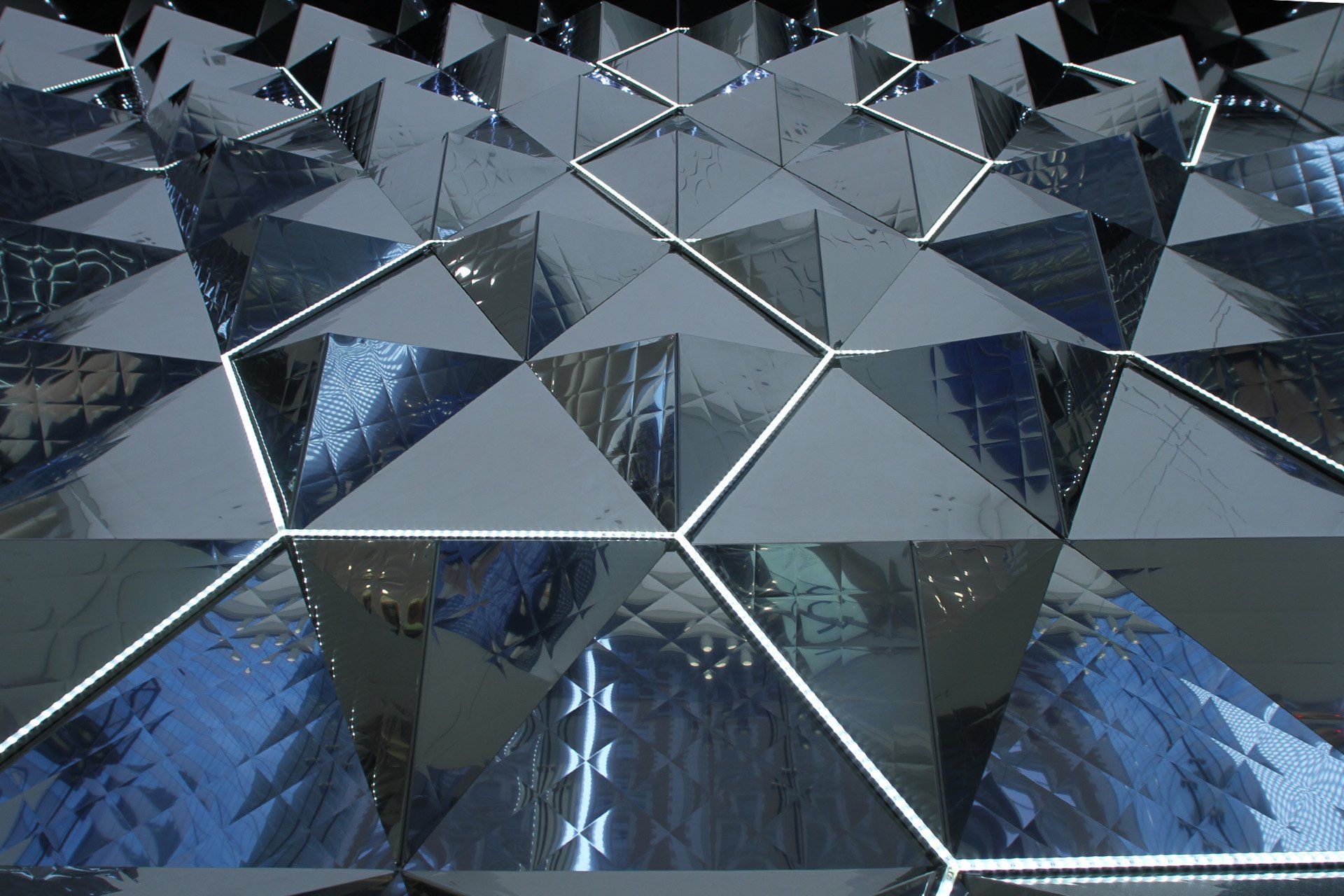 Workspace11 worked closely with the H&M design team and Jeff Taylor Architects to develop the feature Glitter Wall for their international flagship store in Time Square NY. The Glitter wall is fabricated from a custom pressed mirror polished stainless steel sheet formed into three dimensional hexagonal panels that interlock to create a seamless 3 dimensional face that wraps the interior facade. Hexagonal LED light strips randomly illuminate areas of the wall, adding to the endless reflectivity.